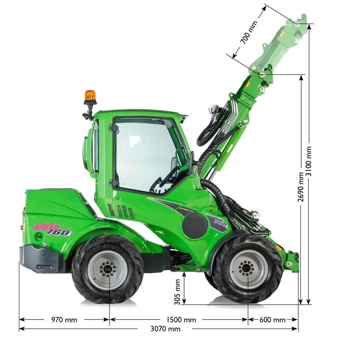 Avant’s telescopic boom makes it possible to have a very compact machine with a great outreach and lift capacity. When the telescopic boom is retracted it is possible to lift heavier loads. With the boom fully extended, the reach and lift height are unparalleled.